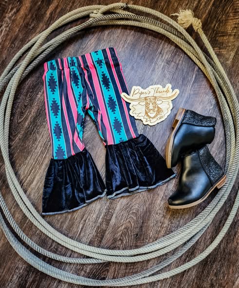 Add a fun, retro vibe to your wardrobe with these 90's Aztec Bells. Featuring a lively pink and teal striped Aztec print paired perfectly with soft black velvet bell bottoms, these pants bring playful flair and comfortable style for any occasion.