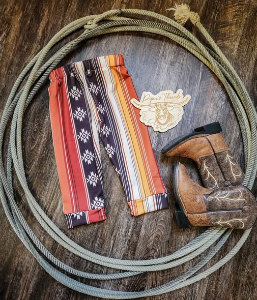 Bring a splash of retro fun to your little one’s wardrobe with these 90's Aztec Loungers. Featuring bold brown, yellow, and white stripes in a lively Aztec pattern, these loungers combine comfort and style perfect for playtime or relaxing.