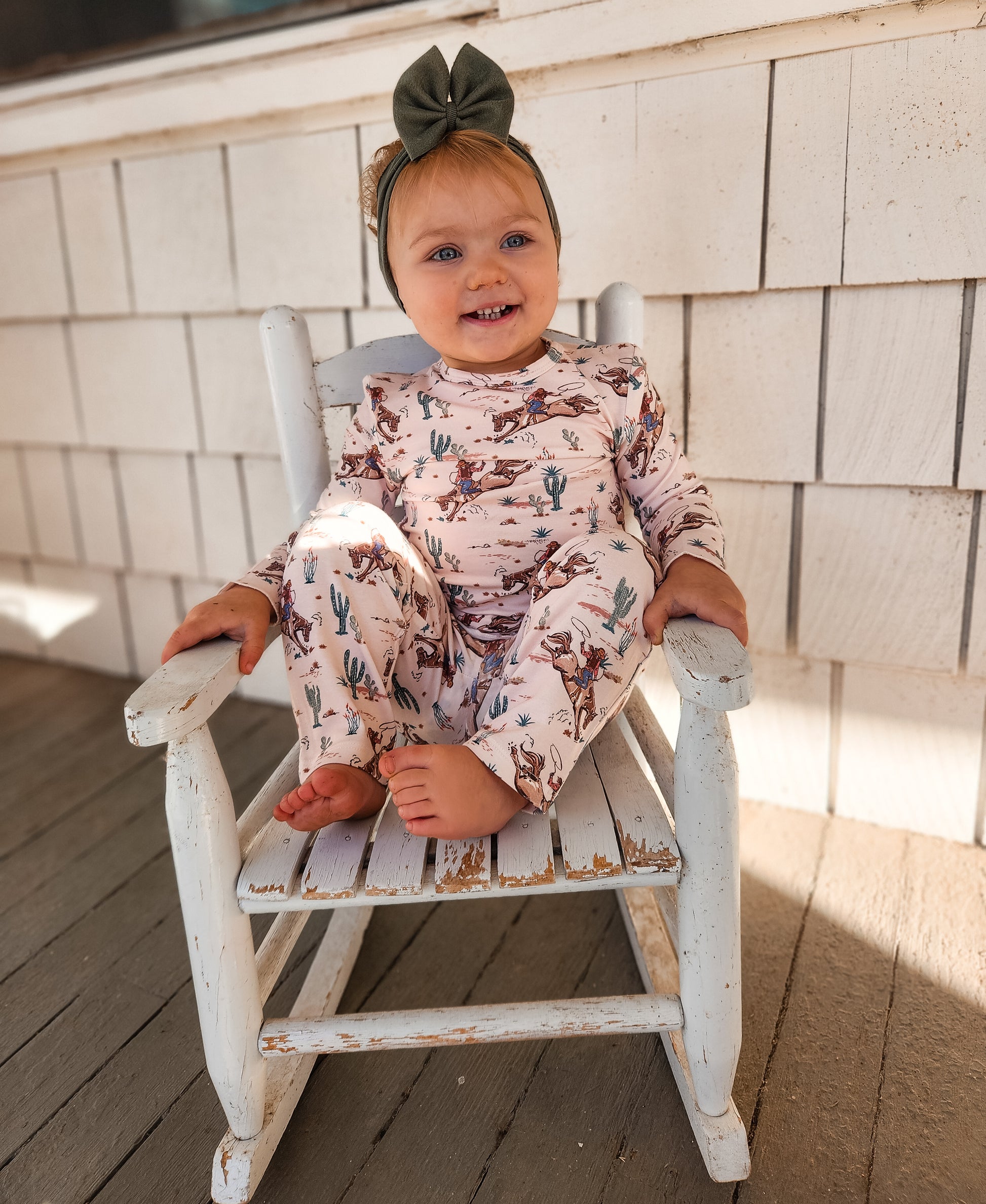 This ultra-soft girls pajama set combines a playful Western-themed print with the perfect balance of comfort and style. Crafted from a bamboo, cotton and spandex blend, these PJs are cozy, absorbent, hypoallergenic, and eco-friendly. The top features a classic round neck, while the bottoms are designed with a comfy elastic waistband.