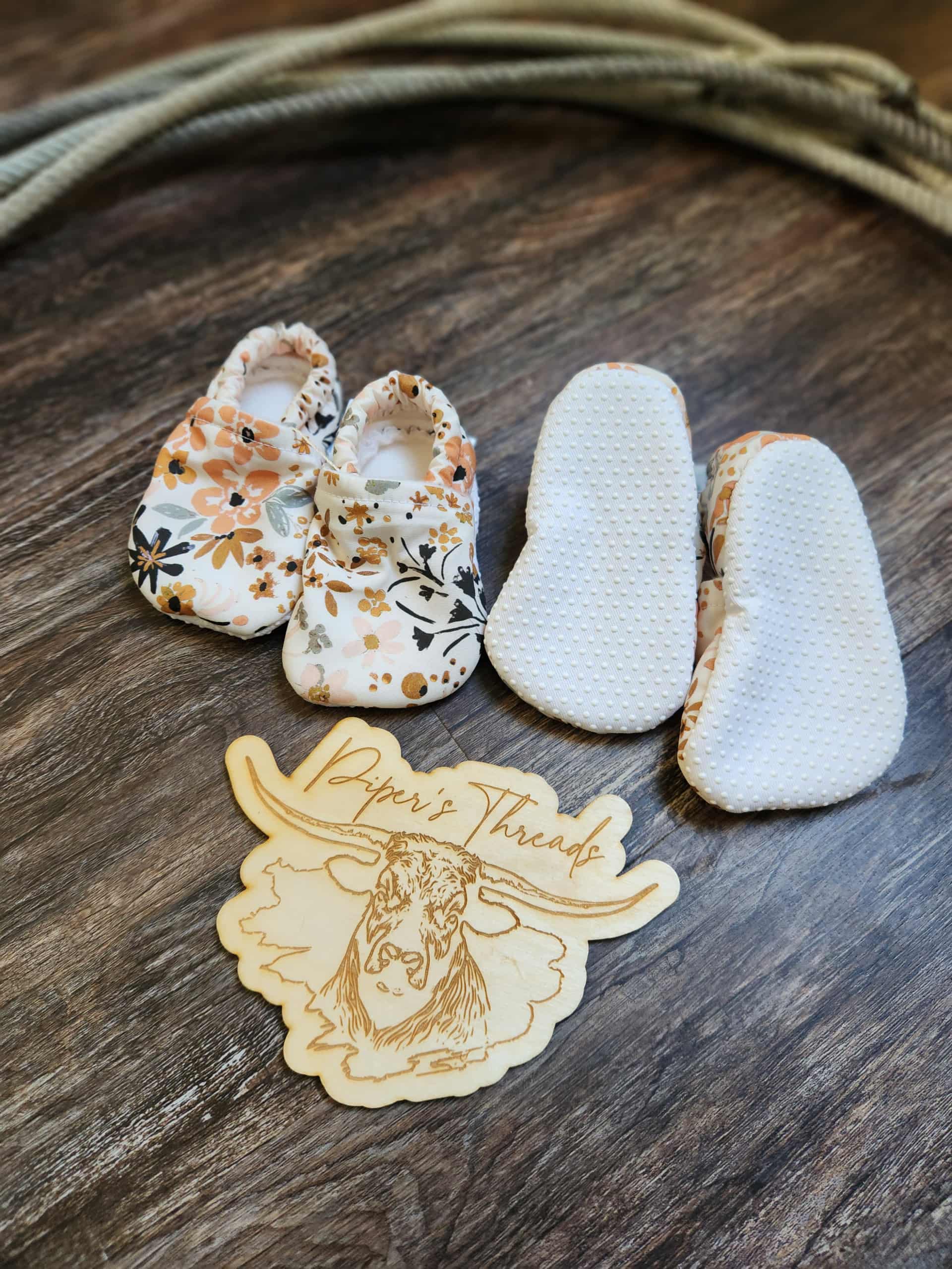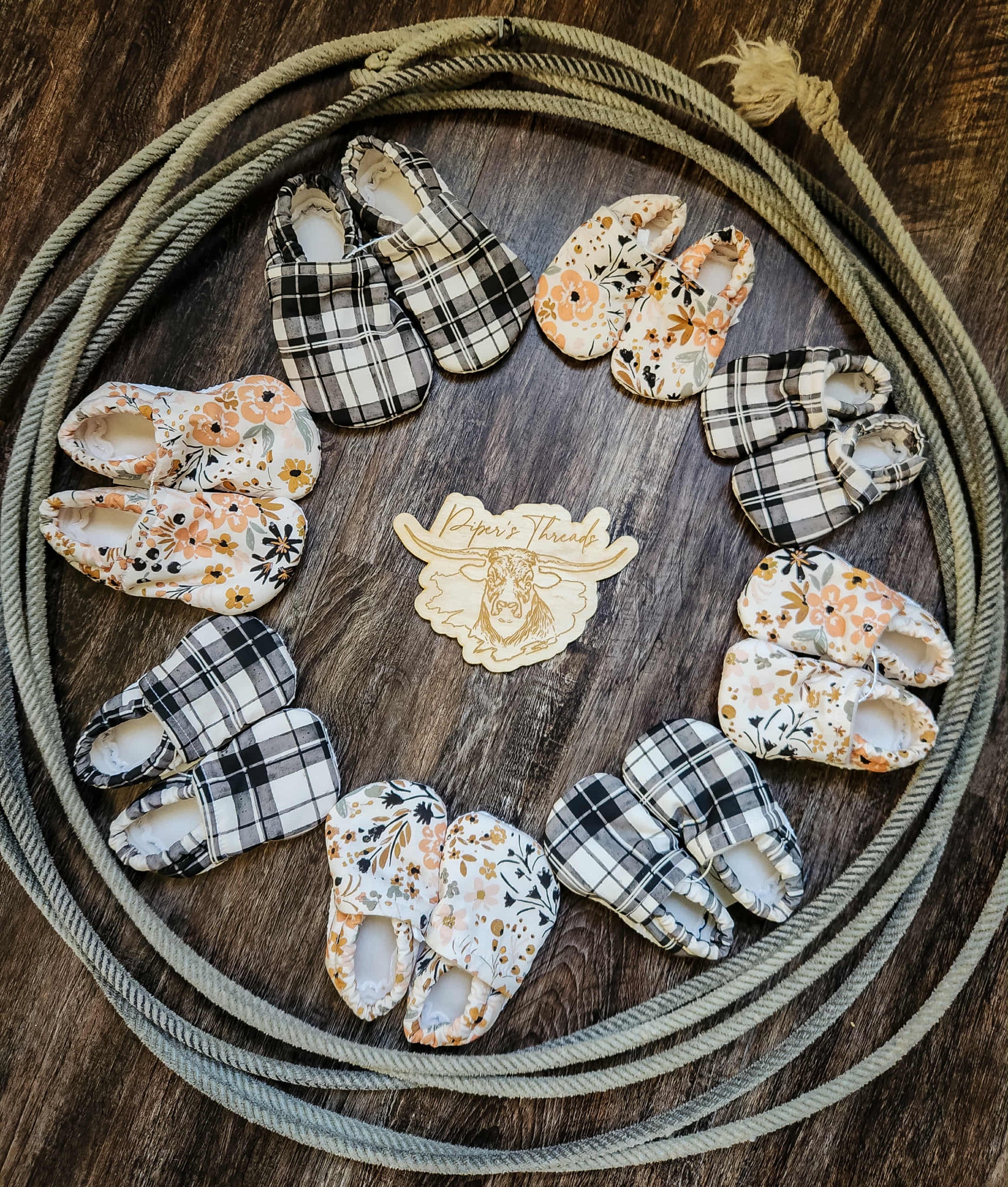 Step into cozy charm with these hand-sewn slipper moccasins! Featuring soft fleece lining to keep your feet warm and grippy bottoms to keep you steady, they’re perfect for lounging or light adventures around the house. Comfy, cute, and ready to hug your little ones feet all day long!